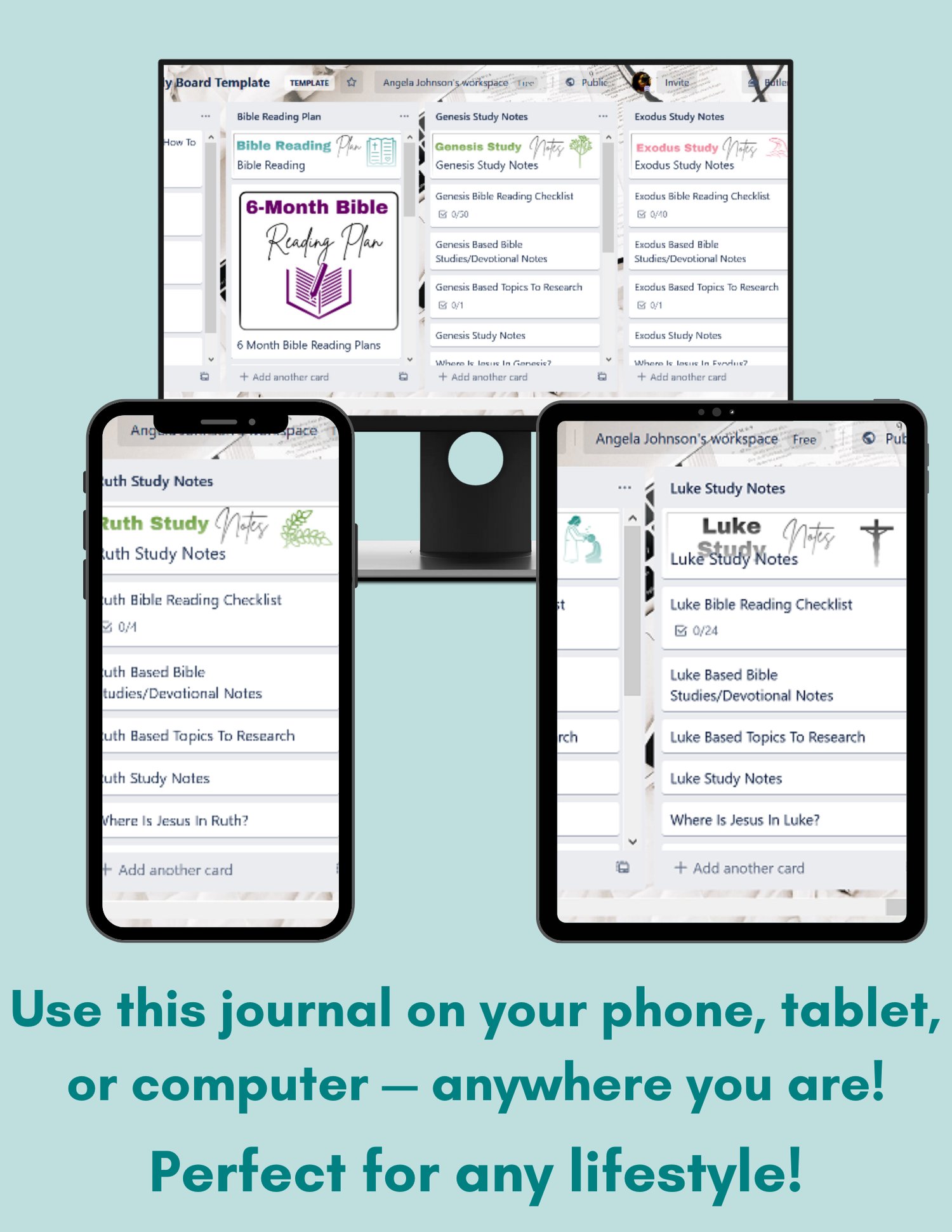 This is not a fill-every-page, do-every-day planner.This is a digital faith journal built inside Trello, a free app that works on your phone, tablet, or computer. You can open it anytime, jot things down quickly, and pick back up where you left off — without starting over.